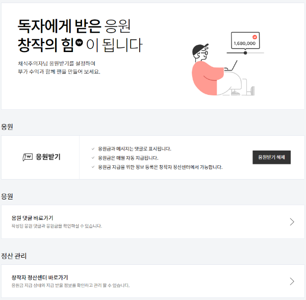 갑자기 수익창에 '응원 관리'라는 메뉴가 생성되었습니다.