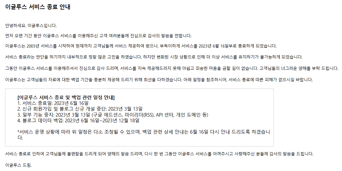[이글루스 서비스 종료 및 백업 관련 일정 안내]